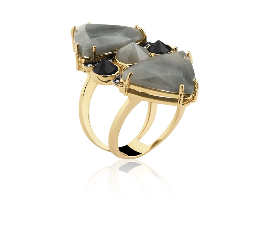 O destaque fica por conta das pedras Olho de Gato em formato orgânico, que refletem a luz com um efeito único e misterioso, criando profundidade e movimento.