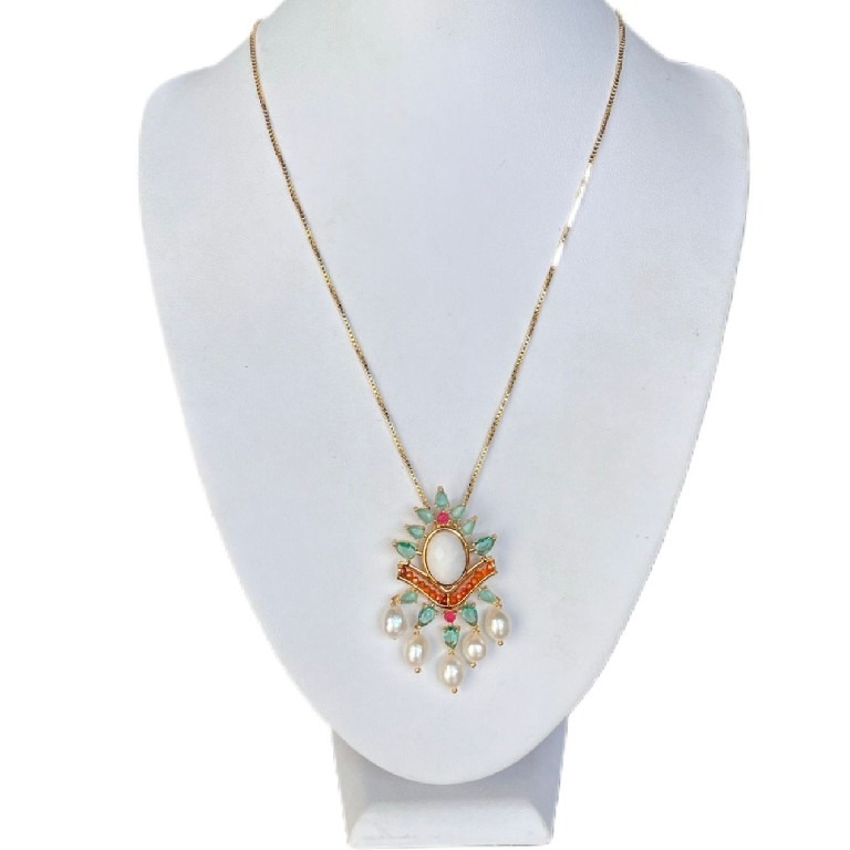Pingente com pérolas shell, cristal turmalina e pedra cornalina